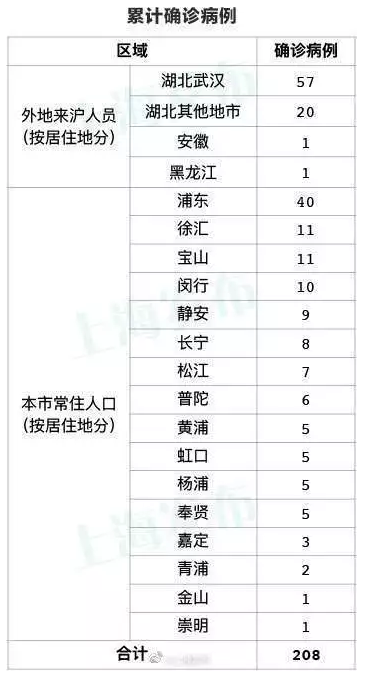 截至2月3日24時,上海市已累計排除疑似病例523例,發(fā)現(xiàn)確診病例208例。確診病例中,男性107例,女性101例;年齡最大88歲,最小7月齡;116例有湖北居住或旅行史,8例有湖北以外地區(qū)居住或旅行史,84例有相關(guān)病例接觸史;外地來滬人員79例,本市常住人口129例。具體情況如下: