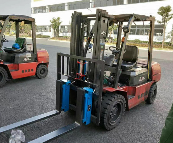 左右貨叉各別裝掛在左右組的模塊上。安裝本產(chǎn)品后的叉車的貨叉,依然能保留其左右側(cè)移的功能,以便調(diào)整其寬度以及仍然能安裝各種叉車的屬具,如夾抱器和旋轉(zhuǎn)器等等。